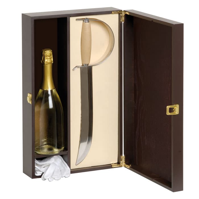 Verbessern Sie Ihre Champagnerfeierlichkeiten mit diesem eleganten Säbel, der in einer Holzbox mit weißen Handschuhen und Platz für eine Champagnerflasche präsentiert wird. Perfekt für besondere Anlässe. Mehr erfahren.